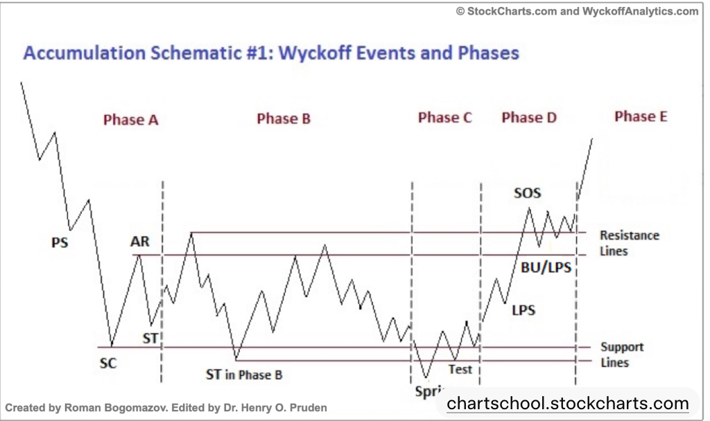 Wyckoff方法是一种技术分析框架,用于识别市场中的供给和需求动态,主要应用于股票、商品和加密货币交易。它将市场周期分为四个主要阶段:积累(Accumulation)、上涨(Markup)、分发(Distribution)和下跌(Markdown)。 以下是简单说明。