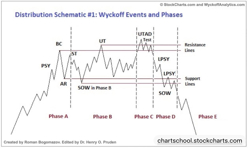 - Phase A:初步供给(Preliminary Supply, PSY)和买入高潮(Buying Climax, BC),价格停止上涨,成交量放大。